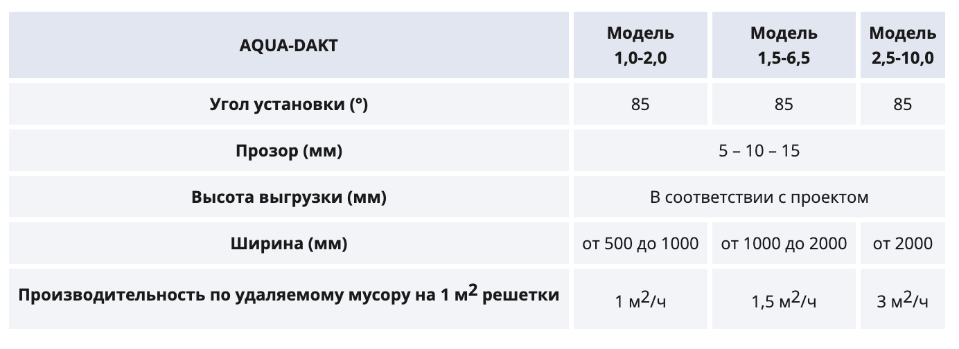 Конструкция Специальная форма фильтрующих элементов решетки AQUA-DAKT обеспечивает высокую производительность и особое положение среди предложений конкурентов: решетка пропускает большие объемы воды с высокой концентрацией взвешенных веществ с большой степенью их извлечения.
